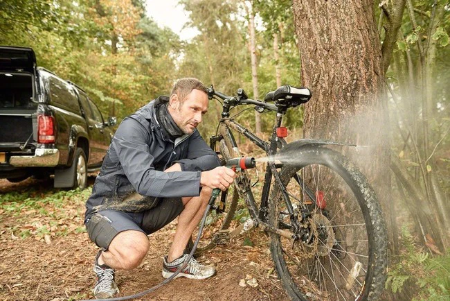 Esta hidrolimpiadora de exteriores nos ofrece la gran ventaja de que al funcionar con batería podemos utilizarla en lugares alejados de la corriente eléctrica, algo que viene bien si la deseamos utilizar en salidas al campo, en jardines, huertas u otros lugares sin toma de corriente. Consigue una presión máxima de 12 bares y viene con un depósito de agua de 15 litros. (se pueden limpiar hasta 3 bicicletas sucias). El set además se complementa con una batería (2,5 Ah), aparato de carga de 1 hora, accesorios de cepillado SmartBrush y accesorio de pulverización.