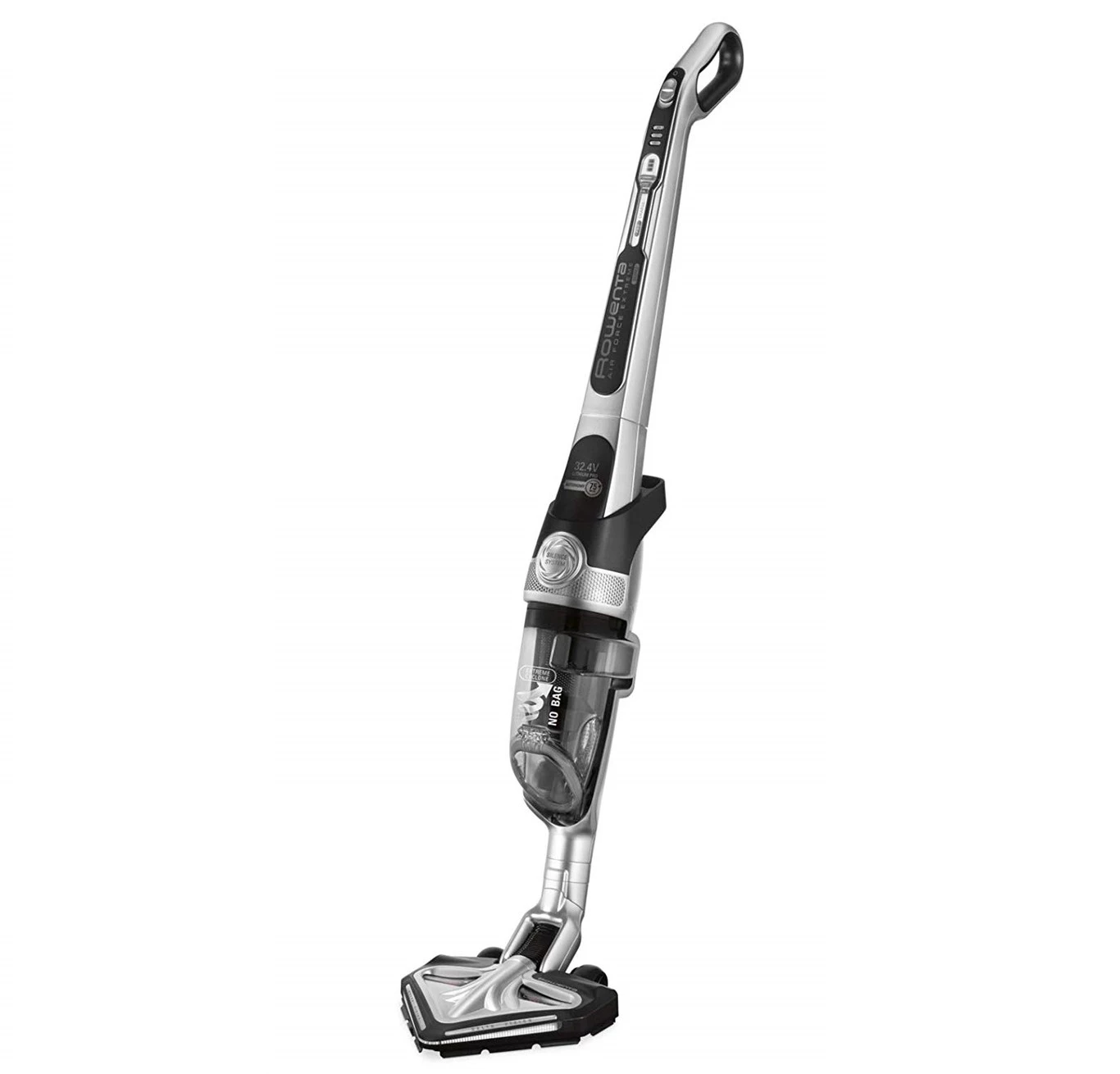 Diseñada y fabricada por una marca líder como es Rowenta, esta aspiradora de tipo escoba viene con una batería Ion-litio de 32,4 V, lo que le da una gran potencia durante su uso y una autonomía de hasta 75 minutos con un ciclo de carga máximo de 6 horas. Incorpora tecnología avanzada Silence capaz de mantener los niveles acústicos en sólo 77 dB, cabezal de aspiración Delta Slim Visión con cepillo motorizado y ultrafino para un fácil acceso bajo los muebles además de forma triangular para limpiar con eficacia las esquinas y una luz LED incorporada para aportar mayor visibilidad a las partes más oscuras.