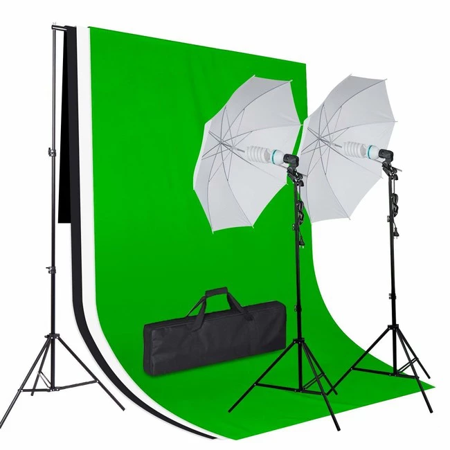 Para quienes quieran montarse un pequeño estudio de fotografía en casa y hacer sus pinitos con fondos croma, este kit tiene todo lo necesario para iniciarse, con luces y trípodes para doblar y ajustar fácilmente, así como paraguas para distribuir la luz de manera uniforme. El soporte es extensible desde 0,65 metros hasta 2 metros como máximo y el kit de iluminación se acompaña de 3 colores de tela de fondo.