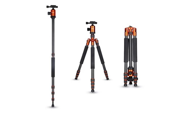 Hablamos de un completísimo trípode compacto de viaje que, es además muy ligero, aunque evidentemente, más en su versión de carbono, con pesos de 1,7 y de 1,5 Kg según la versión que elijamos, pudiendo elegir, en todo caso, entre tres colores de acabado: negro, naranja y plata.