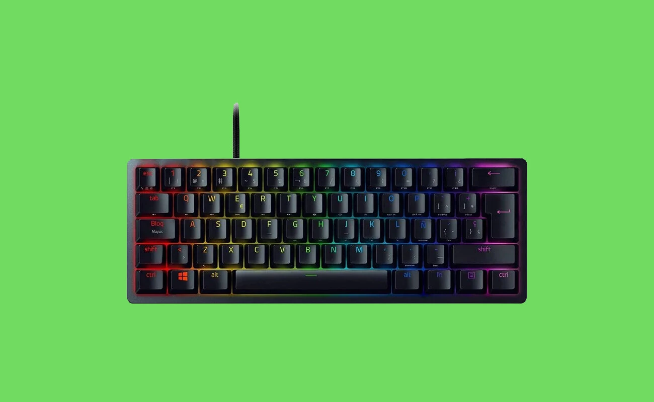 El teclado del que os hablamos es el Razer Hunstman Mini, un teclado tenkeyless del 60%. ¿Qué significa esto? Pues que tan solo ofrece un tamaño de ese porcentaje respecto al tamaño total que suele tener un teclado tradicional. Este tipo de teclados no solo prescinde del teclado numérico, sino que también hace lo propio de los botones f1-f12 en algunas ocasiones, para ofrecer así un tamaño aun más compacto.