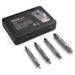Este set extractor de tornillos de 4 piezas está hecho en acero de alta velocidad avanzado H.S.S. 6542 con dureza de hasta 63-65 HRC. Su utilidad es unifuncional: cuando queramos sacar un tornillo atascado que haya quedado dañado o descabezado de tanto insistir, colocaremos una de las puntas en un taladro en sentido contrario a las agujas del reloj y tras hacer un agujero en la cabeza del tornillo colocaremos la rosca para extraerlo. El tornillo quedará inservible pero habremos logrado extraerlo. Este tipo de sets es muy útil para aficionados al bricolaje acostumbrados a restaurar muebles, aunque por su precio debería estar en la mayoría de cajas de herramientas, pues un tornillo rebelde nos puede hacer perder mucho tiempo y de paso, fastidiarnos algunas puntas de atornillador.