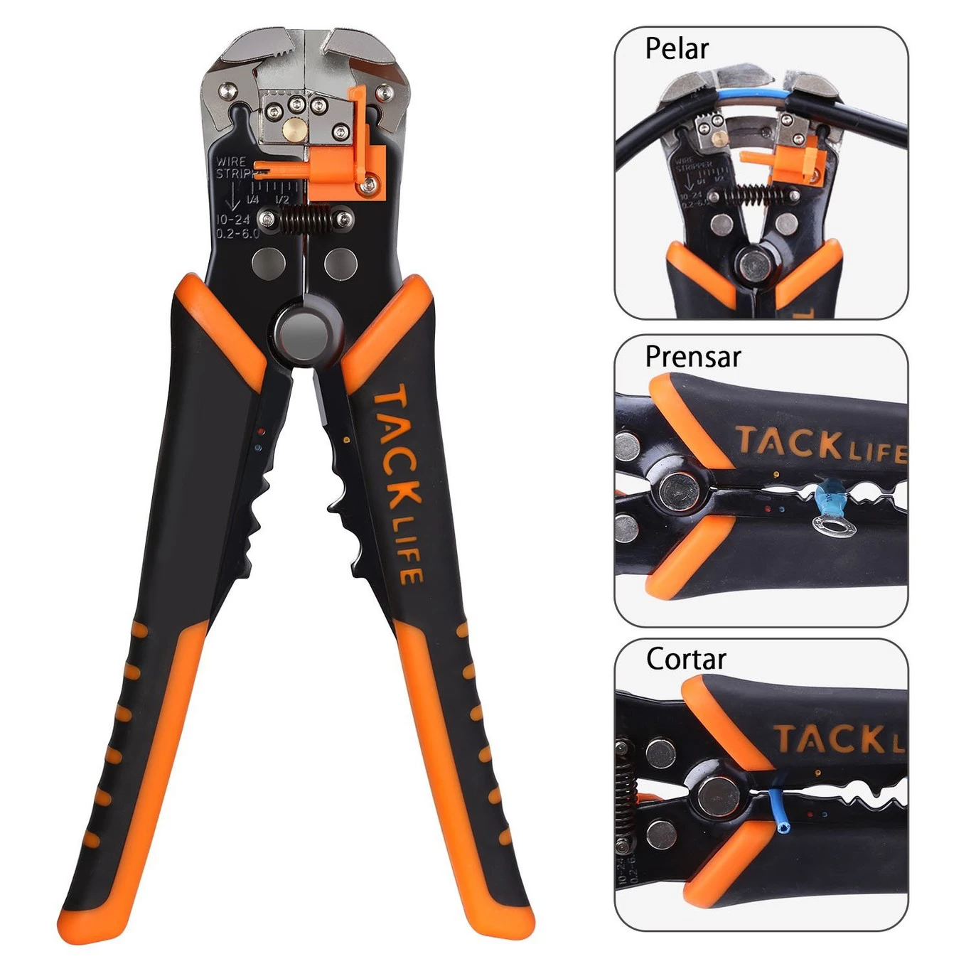Este alicate pelacables automático resulta ideal para electricistas profesionales o aficionados que necesiten pelar, prensar o cortar cables a gran velocidad y sin tener que estar cambiando de herramienta constantemente. Cuenta con una longitud de 210mm y tiene un rango de pelado de entre 0,2 milímetros hasta 6 milímetros. La cuchilla es de acero al carbono para cortar todo tipo de cables sin que se resista ninguno mientras que el mango está hecho de material TPR resistente al desgaste y antideslizante. Tenemos más info e imágenes en la web oficial de Tacklife.