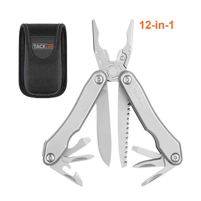 Este alicate 12 en 1 cuenta con alicates de punta fina, alicates regulares, cortador de alambre, abrelatas, abrebotellas, destornillador plano mediano, cuchillo, lima de uñas, destornillador plano grande, sierra, destornillador plano pequeño y destornillador Philips. Todo ellos pudiéndose plegar fácilmente sin ocupar mucho espacio con un peso total de 275 gramos. Una vez plegada ocupa sólo 10.49 x 4.20 x 2.10 centímetros. Viene con funda de nylon con un clip para poder colgarla de una mochila o un cinturón. En la web oficial de Tacklife tenemos más info e imágenes sobre este producto, aunque está totalmente en inglés.