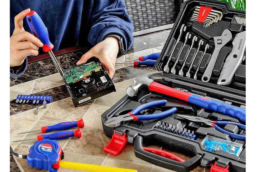 Este completo maletín de herramientas se compone de nada menos que 160 piezas, entre las que encontramos las herramientas más utilizadas en cualquier hogar: martillo, alicates, llave inglesa, destornilladores varios... Todas las piezas están fabricadas en acero al carbono con mango ergonómico bimaterial permite que el trabajo sea más cómodo y seguro.