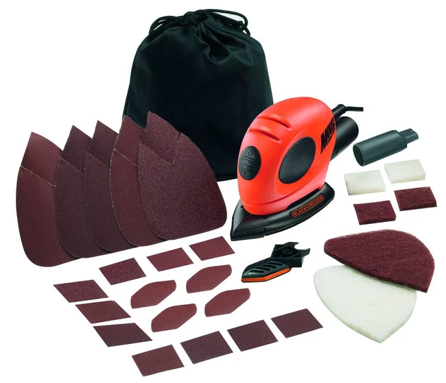 Diseñada y fabricada por una marca líder como es Black & Decker, esta lijadora compacta está especialmente pensada para trabajar en lugares de difícil acceso con facilidad y precisión, realizando los detalles más complicados a la hora de eliminar pinturas y barnices de muebles. Incorpora una gran variedad de puntas removibles de diferentes tipos con enganche de tipo velcro. Estos son sus detalles técnicos: