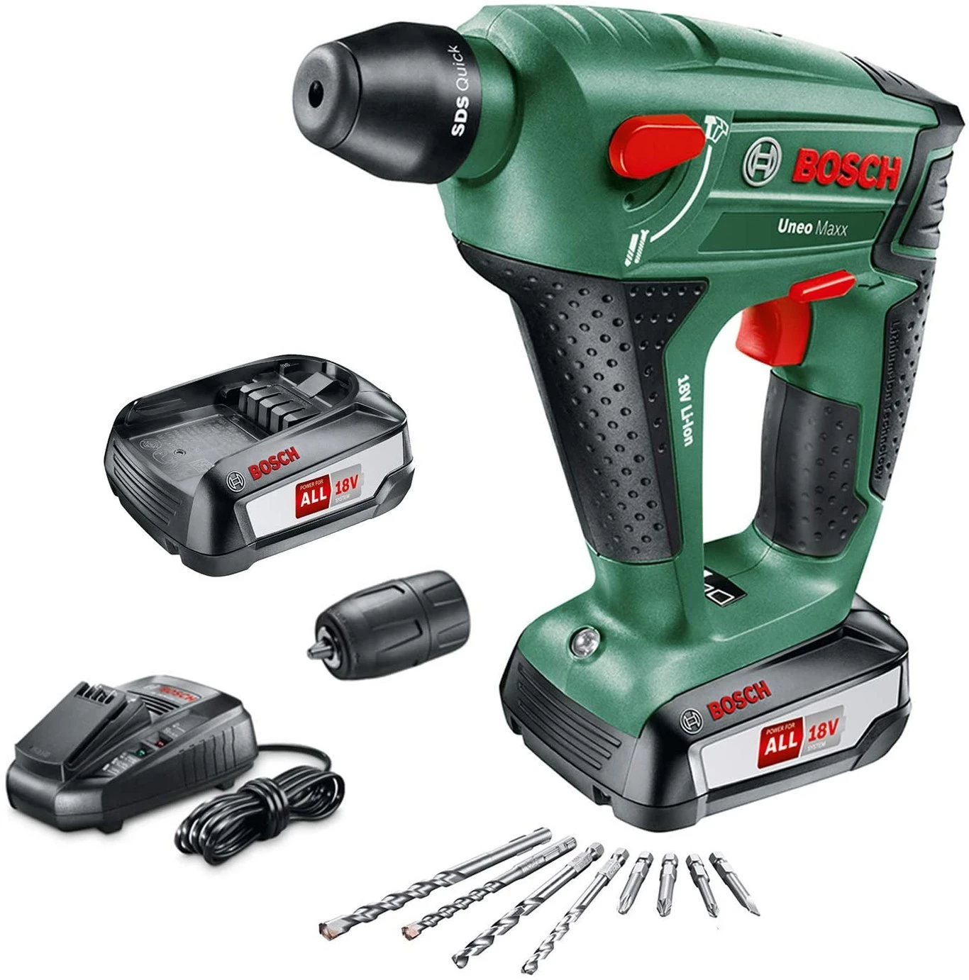 El set al completo incluye martillo perforador a batería UneoMaxx, una batería 18V 2,5Ah, cargador, adaptador de vástago redondo, dos brocas para hormigón SDS-Quick, dos brocas universales, cuatro láminas Bit y un maletín. El taladro es capaz de alcanzar una velocidad en vacío de hasta 900 rpm, mientras que el martillo alcanza un número de impactos de 5000 rpm.