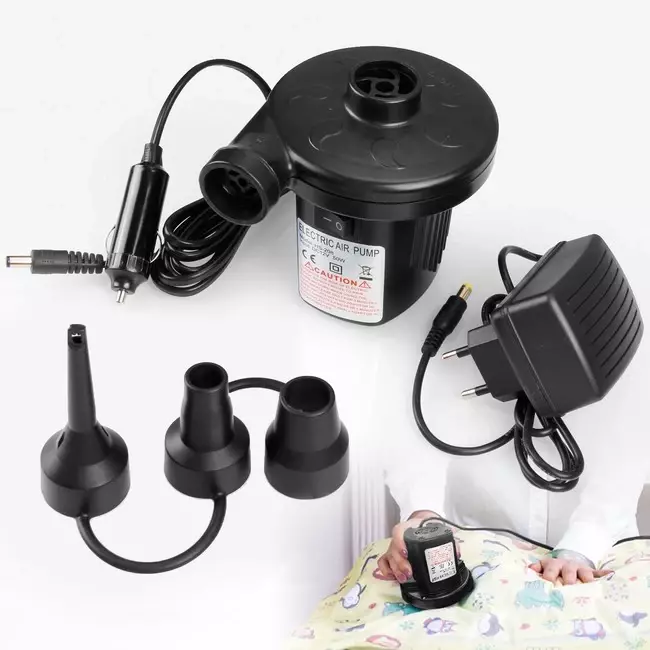 Se trata de una bomba eléctrica de color negro con 3 boquillas diferentes para adaptarlas a los diferentes productos, ya que con ella se pueden inflar colchonetas, flotadores, camas de aire para los invitados... tiene un tamaño de 13cm x 10cm x 11.8cm y una potencia de 220V en el hogar y de 12V si la usamos con el mechero del coche.