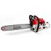 Equipada con motor de gasolina 2 tiempos de 62cc y 3,8cv con bloqueo de seguridad y arranque fácil E-start, sistema anti-vibración que reduce la fatiga, mango ergonómico, freno de cadena que actúa en caso de retroceso y engrase automático de cadena para un perfecto funcionamiento.