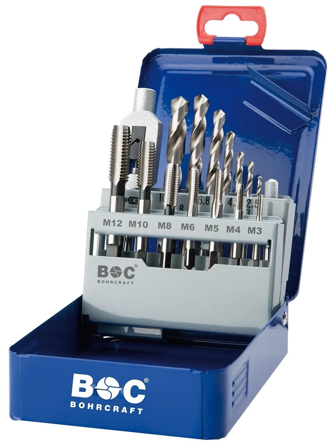 Este completo set de Bohrcraft nos permite crear roscas en láminas, segmentos, pletinas u otros elementos de metal. Al crear una rosca podemos sujetarlas con un tornillo, algo que en ocasiones puede resultarnos muy útil. Si es la primera vez que lo has hecho es sencillo: primero hay que realizar un agujero con el taladro de la medida correspondiente a la rosca que queremos crear. Después, con cuidado y sin darle mucha potencia al taladro, introducimos la broca roscadora que debe crear una rosca en el agujero. El set está compuesto por siete brocas y siete puntas roscadoras.