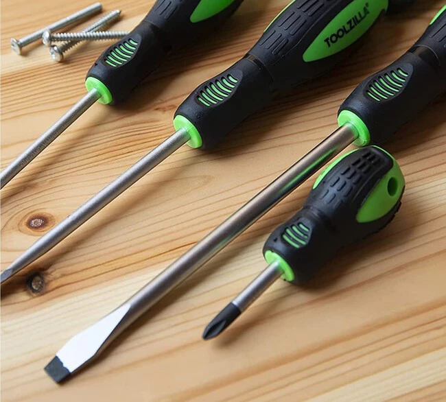 Tal y como podemos ver en la imagen superior, estamos ante un completo juego de destornilladores diseñado para uso profesional y bricolaje que incluye un poco de todo: destornilladores ranurados de la mejor calidad, destornilladores Pozidriv, destornilladores de cabeza plana y destornilladores Phillips también. El mango cuenta con diseño ergonómico bimaterial, lo que lo hace resistente y cómodo a la vez.