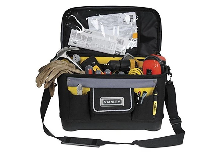 Esta bolsa de herramientas rígida Stanley cuenta con múltiples bolsillos internos y externos para poder mantener una buena organización de nuestras herramientas. Tiene refuerzos de esquina fuertes, rígidos y duraderos para reforzar la estructura de la bolsa, que no olvidemos está hecha de nylon. Viene con correa de hombro ajustable y compartimento transparente separado para documentos ayuda a mantener sus documentos y pertenencias personales limpias. Sin duda es una bolsa muy versátil con unas medidas que permiten llevar bastante herramienta sin cargarnos en exceso (Las medidas son 44,7 x 26,2 x 25,1 cm). Tenemos más info e imagenes en la web oficial de Stanley.