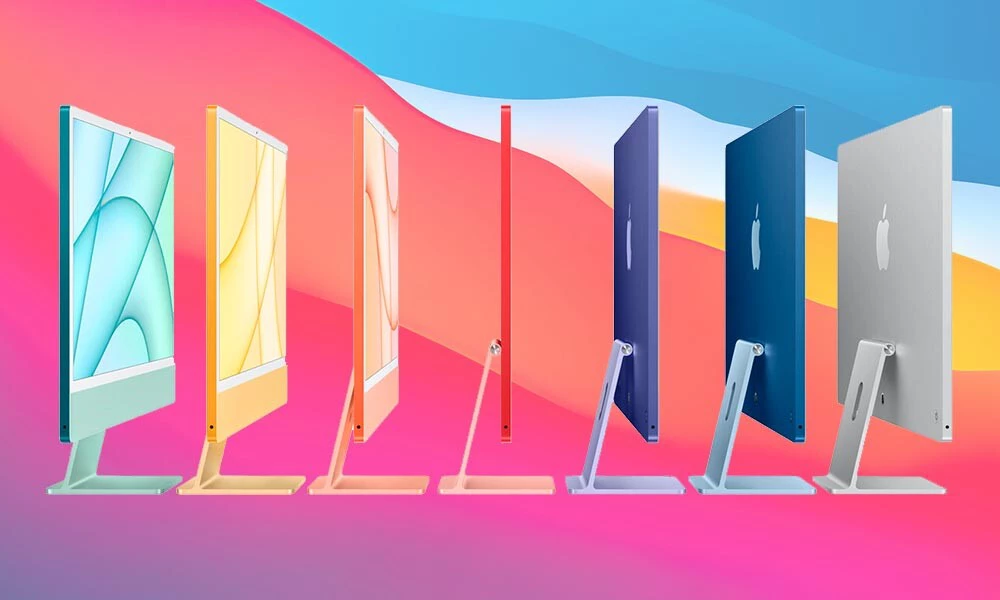 Ahora, este iMac sube de diagonal hasta las 24 pulgadas dejando atrás las 21 en las que se mantenía el modelo base desde hace años. El diseño de su cuerpo es ahora completamente plano (recuerda a una tableta) y no se queda en el típico color plata, sino que se nos ofrece hasta en 7 colores diferentes (los que componían el arcoíris del logo de la manzana hace años).