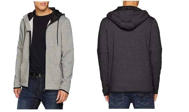 Diseñadas y fabricadas por la firma Jack & Jones, estas sudaderas con capucha forrada en otro tono con cordones cuentan con cierre de cremallera y bolsillos laterales. Están disponibles en negro o gris en una gran variedad de tallas, aunque dependiendo del color elegido y la talla el precio varía bastante, tal y como podemos ver en la siguiente imagen: