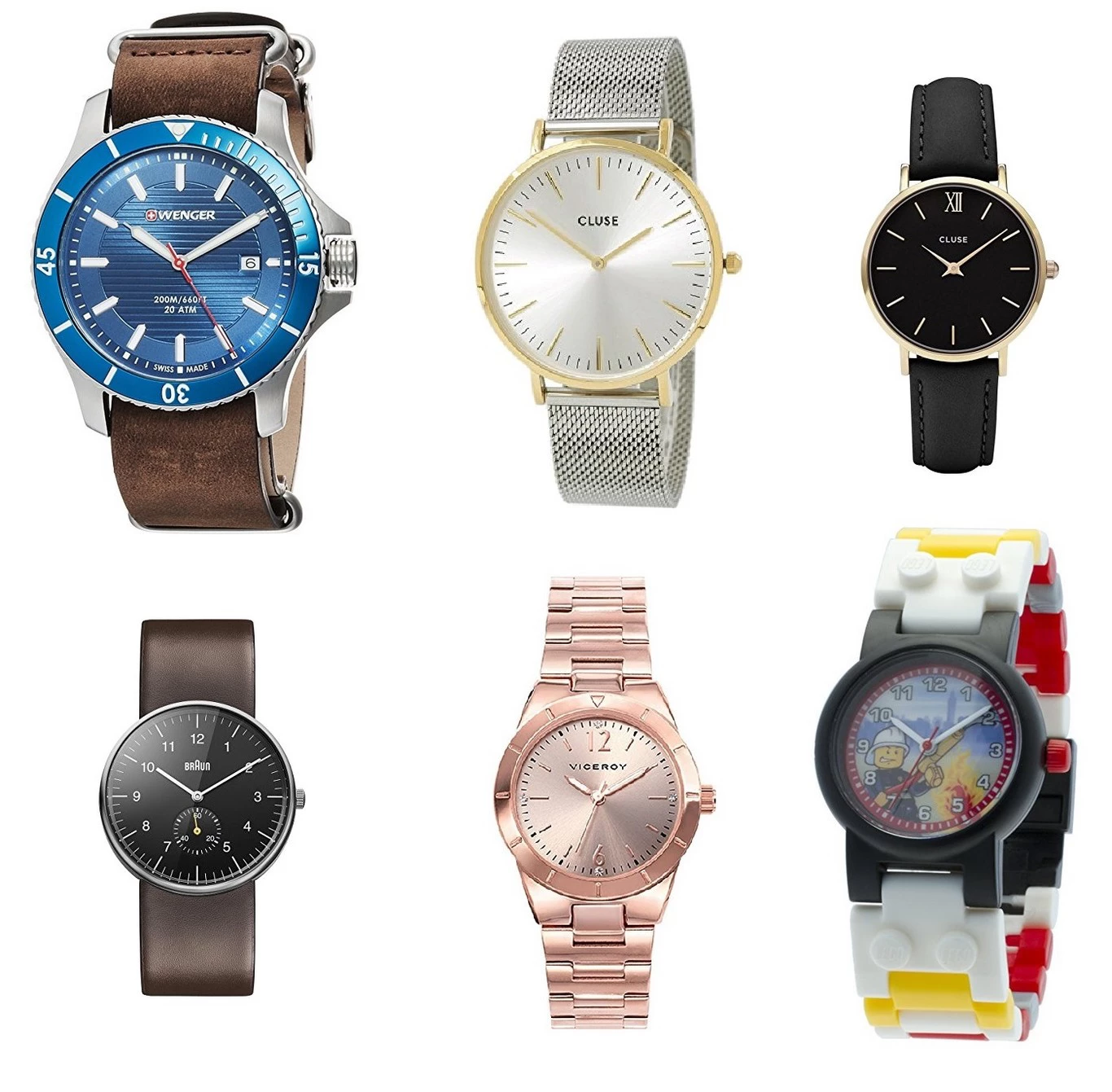 Si estamos buscando un reloj de pulsera Amazon nos ofrece seis ofertas en relojes para hombre, mujer y niño en diferentes marcas tales como Viceroy, Cluse, Braun, Lego y Wenger:
