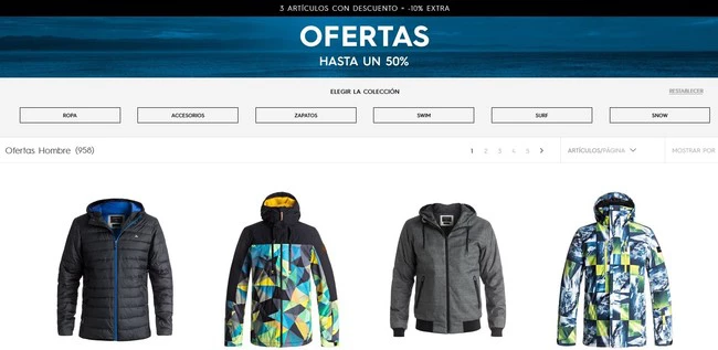 Quiksilver nos ofrece una amplia variedad de artículos ya rebajados en su web oficial. Aunque hay bastante equipo de esquí o abrigos que están en pleno fin de campaña, también podemos encontrar camisetas, camisas o jerseys perfectos para la temporada hacía la que vamos. Además, podemos ahorrarnos un 10% extra si compramos al menos 3 productos rebajados.