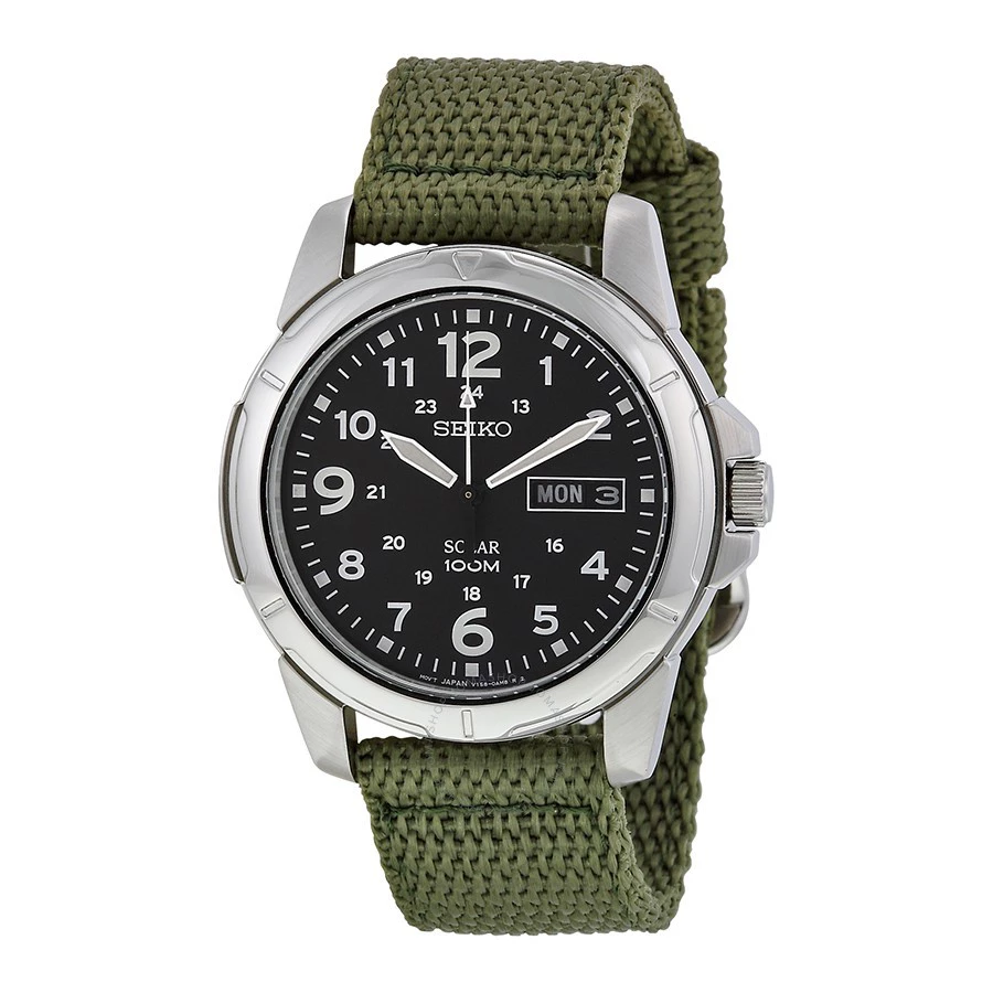Este práctico y elegante reloj Seiko reloj viene con todas las funciones necesaria, incluyendo ventana de fecha y día, manecillas luminosas y segundero. Su principal atractivo es que se trata de un reloj solar que no necesita de pilas o baterías: sólo de la luz del sol. Es resistente al agua 100 metros y cuenta con caja de acero y una fuerte correa de estilo militar.
