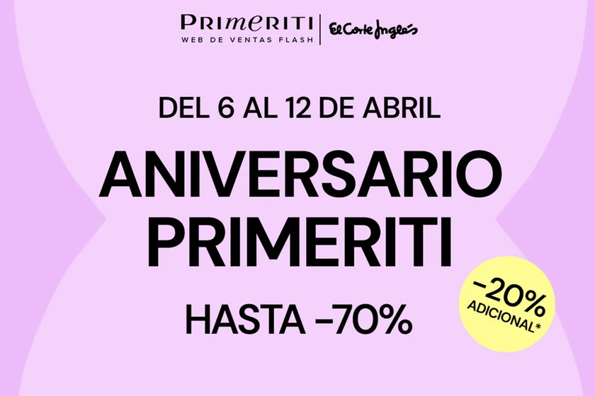La Semana Santa ha terminado y muchos hemos vuelto a la rutina. Eso sí, lo hacemos con el Aniversario de Primeriti, la web de ventas flash de El Corte Inglés. Como de costumbre, nos vamos a encontrar muy buenos precios y descuentos en marcas de todo tipo, pero con un aliciente extra de lo más jugoso: recibiremos un 20% de descuento adicional en todas las compras superiores a 50 euros.