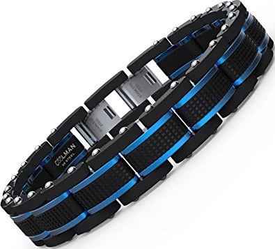 Se trata de una pulsera azul y negra que podemos llevar en cualquier ocasion, realizada en cero inoxidable 316L es wearproof y anti corrosión. Es ajustable por lo que si tienes la muñeca un poco más pequeña que la pulsera no será un problema, ya que se pueden sacar eslabones.