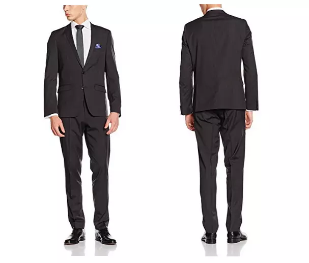 Este traje en color gris oscuro está fabricado en un 84% Poliéster, 14% Viscosa y 2% Elastano, y al igual que la mayoría de trajes, sólo permite lavado en seco. Amazon lo tiene disponible en la mayoría de tallas que van desde la 52 a la 106.