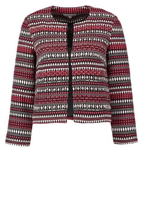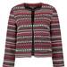 Como podemos ver en la imagen superior estamos ante una chaqueta tipo blazer con un estampado de rayas con motivos geométricos en negro, blanco y rojo. La parte exterior es 65% viscosa y 35% poliéster, con un relleno de 52% poliéster y 48% viscosa.