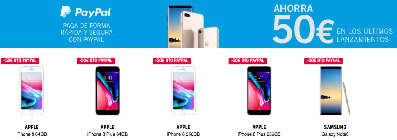 Hasta el 3 de octubre, en Phone House, puedes ahorrar 50 euros si realizas el pago de un iPhone 8, iPhone 8 Plus o Samsung Galaxy Note 8 a través de PayPal. Eso sí, el envío tiene un coste de 4 euros aunque puedes recoger el pedido gratuitamente en cualquiera de sus tiendas.