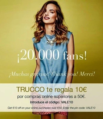 En esta ocasión os hablo de Trucco, que acaba de alcanzar los 20.000 fans y como agradecimiento, regala 10 euros por cada compra. Lo único que hay que hacer es insertar el código que nos indican, ya que se trata de una promoción válida solo para compras online. No en tiendas físicas.