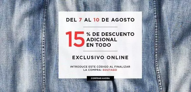Se aplica, claro, en el total de nuestra compra, solo en compras online y solo del 7 al 10 de agosto de este 2014. Lo único que hay que hacer es introducir el código 6OUTAGO al finalizar la compra y el 15 % de descuento se rebajará sobre el precio total.