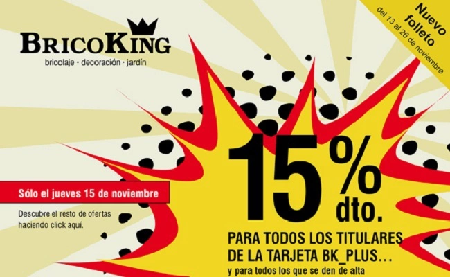 En este caso Bricoking lanza un 15% de descuento en sus tiendas, pero solo aplicable a los productos que ya están en stock y solo válido para las compras que se hagan el próximo jueves 15 de noviembre. Por supuesto, y como siempre, este descuento no es acumulable a otras ofertas