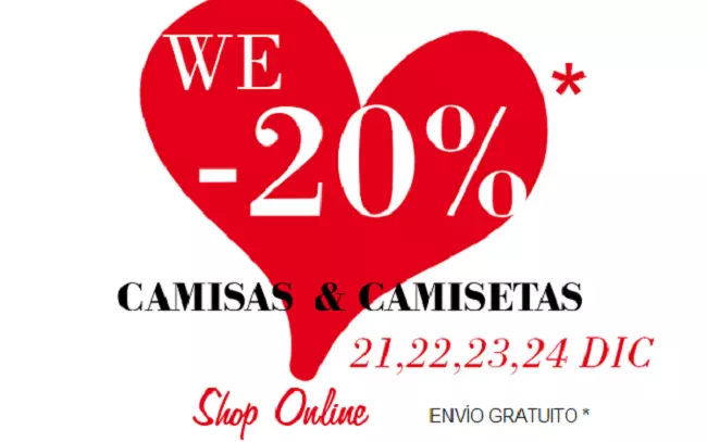Un descuento del 20% con fecha de inicio y de fin, para los días 21, 22, 24 y 24 de diciembre en una selección de camisas y camisetas. Solamente tienes que realizar el pedido, y el descuento se realizará directamente en la cesta de la compra.