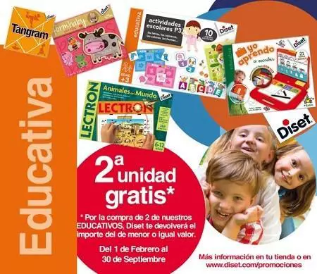 Hasta el 30 de septiembre y por la compra de dos juguetes educativos de Diset te devuelven el importe del de menor o igual valor. Los juguetes incluidos en la oferta están dentro de una selección que podemos ver en la web y es una promoción perfecta para que una compra futura nos salga gratis
