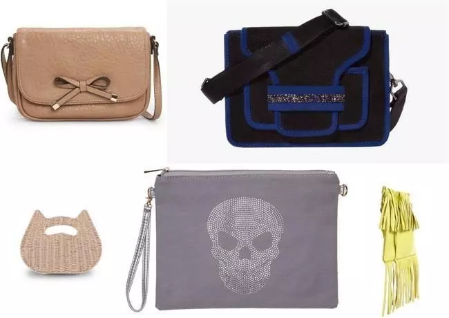 Bolso en color amarillo flúor con flecos de Asos, bolso de rafia con forma de gato de SuiteBlanco, bolso bandolera cuadrado de Stradivarius y un bolso de mano en color gris con calavera de strass en plata de Kiabi, todos con unos precios de auténticos coletazos finales de rebajas.