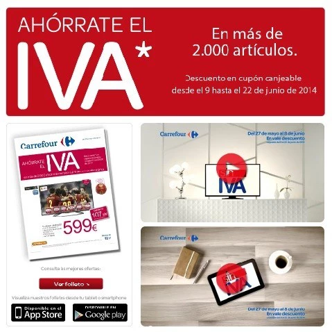 Y es que puedes ahorrarte el IVA en más de 2000 artículos de electrónica, comprando desde hoy 27 de mayo hasta el 8 de junio en Carrefour. El descuento, equivalente al importe del IVA de cada artículo, que es como realmente se debería decir, te lo entregarán directamente en un cupón, canjeable desde el 9 al 22 de junio de 2014 en tu próxima compra.