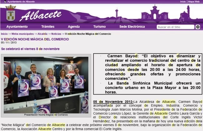 Albacete se viste hoy de gala y tendrá su "Noche Mágica" para incentivar el consumo de 8 de la tarde a 12 de la noche. Serán cerca de 250 comercios del centro de la capital albaceteña quienes participarán hoy mismo en esta iniciativa que persigue «dinamizar y revitalizar el comercio tradicional de Albacete», ha dicho la alcaldesa, Carmen Bayod, en su presentación ante los medios hace unos días.
