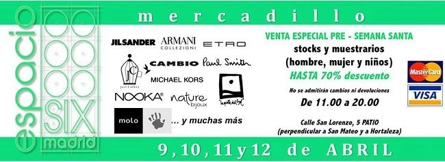 Se trata de una venta especial de stocks y muestrarios de firmas nacionales e internacionales con descuentos de hasta un 70 %. Podremos encontrar todo tipo de artículos para hombre, mujer y niños, y en todas las tallas. Marcas de todo tipo: Armani Collezioni, Etro, Jil Sander, Jail Calher, La Quinta del Sol, Plein Sud, Nature Bijoux, Joe's Jeans, Tee Library, Paul Smith, Molo, Piu et Nau...