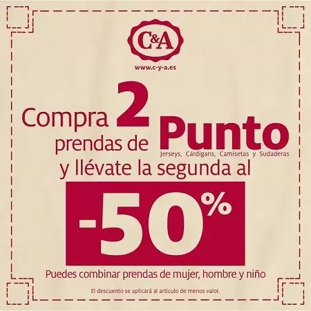 Seguimos hablando de descuentos este miércoles, pero en este caso ya de la ropa un poco más invernal. Nos referimos a prendas de punto y a una promoción especial que tienen activa en todas las tiendas C&A. Al comprar dos, la segunda unidad te queda al 50 % de descuento.