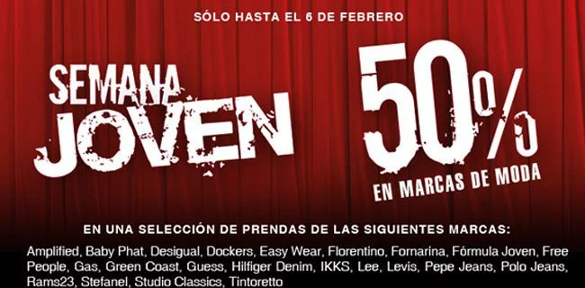 En 'El Corte Inglés' siguen de rebajas y esta semana les ha tocado el turno a las marcas jóvenes, que ofrecen hasta un 50% de descuento en sus productos. Y estamos hablando de marcas como Baby Phat, Desigual, Dockers, Easy Wear, Florentino, Amplified, Fornarina, Fórmula Joven, Gas, Free People, Guess, Green Coast, IKKS, Hilfiger Denim, Lee, Levis, Pepe Jeans, Polo Jeans, Rams23, Stefanel, Studio Classics, y Tintoretto.