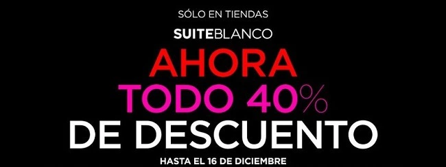 Se trata de un 40% de descuento en todas tus compras superiores a 40 euros que estará activo hasta el domingo 16 de diciembre. Es decir, que nos queda algo más de una semana todavía para disfrutarlo. Descarga el cupón descuento y preséntalo impreso al hacer tu compra en las tiendas Blanco, o simplemente enseña la imagen del mismo en tu teléfono móvil, que eso también vale.