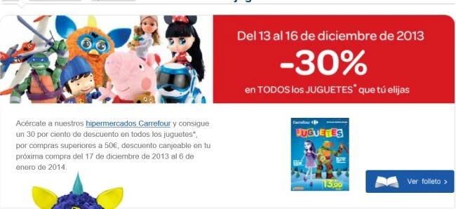 La compra mínima en juguetes será de 50 euros y podrás usar el descuento en tu próxima compra realizada del 17 de diciembre de 2013 al 6 de enero de 2014.