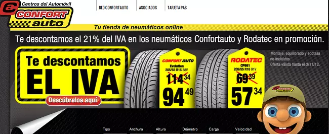 Lleva en vigor desde el 10 de septiembre y estará activa hasta el 3 de noviembre. Los talleres de mecánica rápida del automóvil líderes en España y Portugal anuncian que en estas fechas descontarán el 21% del IVA en la compra de neumáticos Confortauto y Rodatec, que los podemos ver en su página web donde puedes elegir también cuáles son los que necesitas.