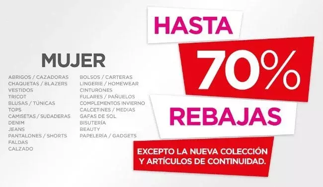 Ya en las últimas semanas de estas rebajas de invierno, nos anuncian un 70% de descuento en toda la tienda, menos en artículos de continuidad y de temporada. Podemos echar un ojo en la web para ir con una idea ya de lo que nos vamos a encontrar y ver los precios tan reducidos por los que nos podemos llevar a casa algunas de nuestras prendas favoritas.