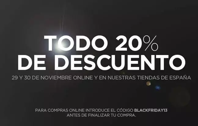 En Blanco, el descuento lo tienes tanto hoy viernes 29 de noviembre como mañana sábado 30, y es de un 20 % en todas tus compras, tanto en tiendas físicas como en la tienda online. Para compras por internet hay que usar el código BLACKFRIDAY13 antes de finalizar nuestro pedido.
