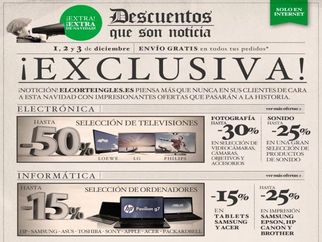 Si creías que lo habías visto todo estabas un pelín equivocado ya que El Corte inglés quema un cartucho muy a tener en cuenta para los amantes del ahorro previo antes de las navidades. Hoy mismo lanza ¡Descuentos que son noticia! pero sólo encontrarás estas ofertas por Internet y además el envío es gratis en todos tus pedidos.