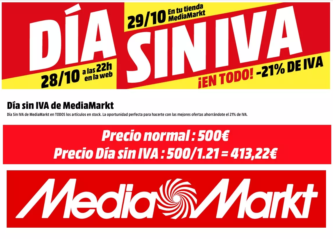 Desde el 28 de octubre, a las 22:00h, y durante el 29 de octubre regresa el Día Sin IVA a MediaMarkt. En todo su catálogo te ahorras el 21% de IVA, tanto en tiendas como en su web. Los envíos son gratis a tienda y desde 1,99 euros a domicilio.