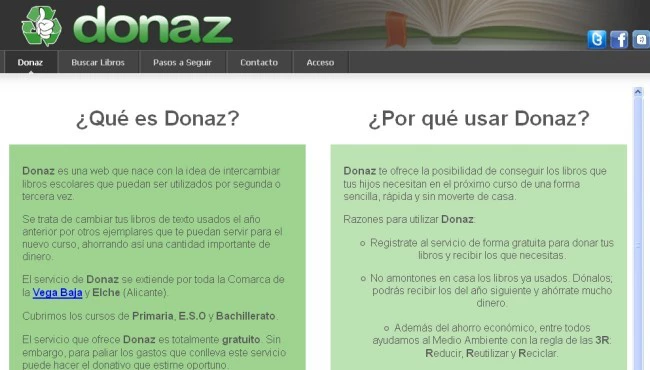 Se llaman Donaz y la ha creado un joven de Callosa de Segura (Alicante) llamado Alejandro Sarmiento. Es una página web para intercambiar libros de texto de forma gratuita y así permitir un ahorro para las familias. La página cubre primaria, secundaria y bachiller de varias localidades alicantinas (Comarca de la Vega Baja y Elche (Alicante)).