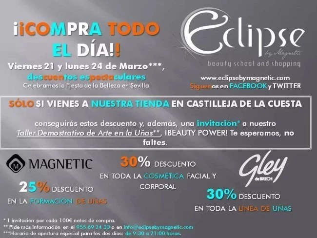 Para tal ocasión tienen preparadas un montón de ofertas para que ahorres el lunes día 24 de marzo, desde un 25 % en la formación de uñas, un 30 % en toda la cosmética facial y corporal y para rematar un interesante 30 % en toda la línea de uñas.