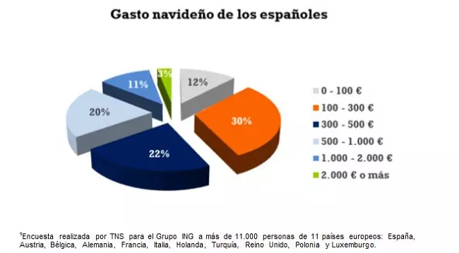 España es el país europeo donde la población menos se preocupa por los gastos en estas fechas, seguido de Alemania y Polonia, con un 43%. Un mes antes de las Navidades, sólo el 32% de los españoles afirmaba tener un presupuesto cerrado mientras que el resto reconocía no haber fijado ninguna cantidad. El 30% de los españoles reconoce gastar entre 100 y 300 euros, un 12% afirma que no sobrepasará los 100 euros y sólo el 3% superará los 2.000 euros.