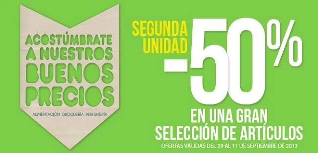 En estos momentos tenemos activa una promoción de la que podemos beneficiarnos de aquí al 11 de septiembre. Se trata de un 50% de descuento en la segunda unidad de una gran selección de artículos, tanto en las secciones de alimentación como de droguería o de perfumería.