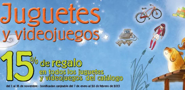 Activa del 1 de noviembre al 18 de noviembre, si realizas un pedido de videojuegos y/o juguetes incluidos en el catálogo 'Juguetes y Videojuegos de Navidad 2012-2013' que puedes ver también en la web, te regalan el 15% del importe de tu compra. ¿Cómo? Pues con una tarjeta que podrás utilizar para posteriores compras online o en tienda en estos departamentos entre el 7 de enero y el 28 de febrero de 2013.
