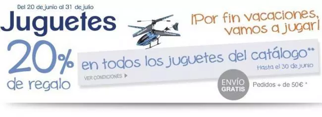 En Ahorro diario pensamos más en aprovechar esta promoción de un 20 % de regalo en el caso de tener alguna compra pendiente para un cumpleaños o una comunión, que seguimos en época. La promoción estará activa para compras entre el 20 y el 30 de junio. Al hacer un pedido de juguetes incluidos en el catálogo 'Juguetes Verano 2014' con el sello identificativo te regalarán el 20 % del importe de tu compra para canjear hasta el día 31 de julio en futuras compras de juguetes.